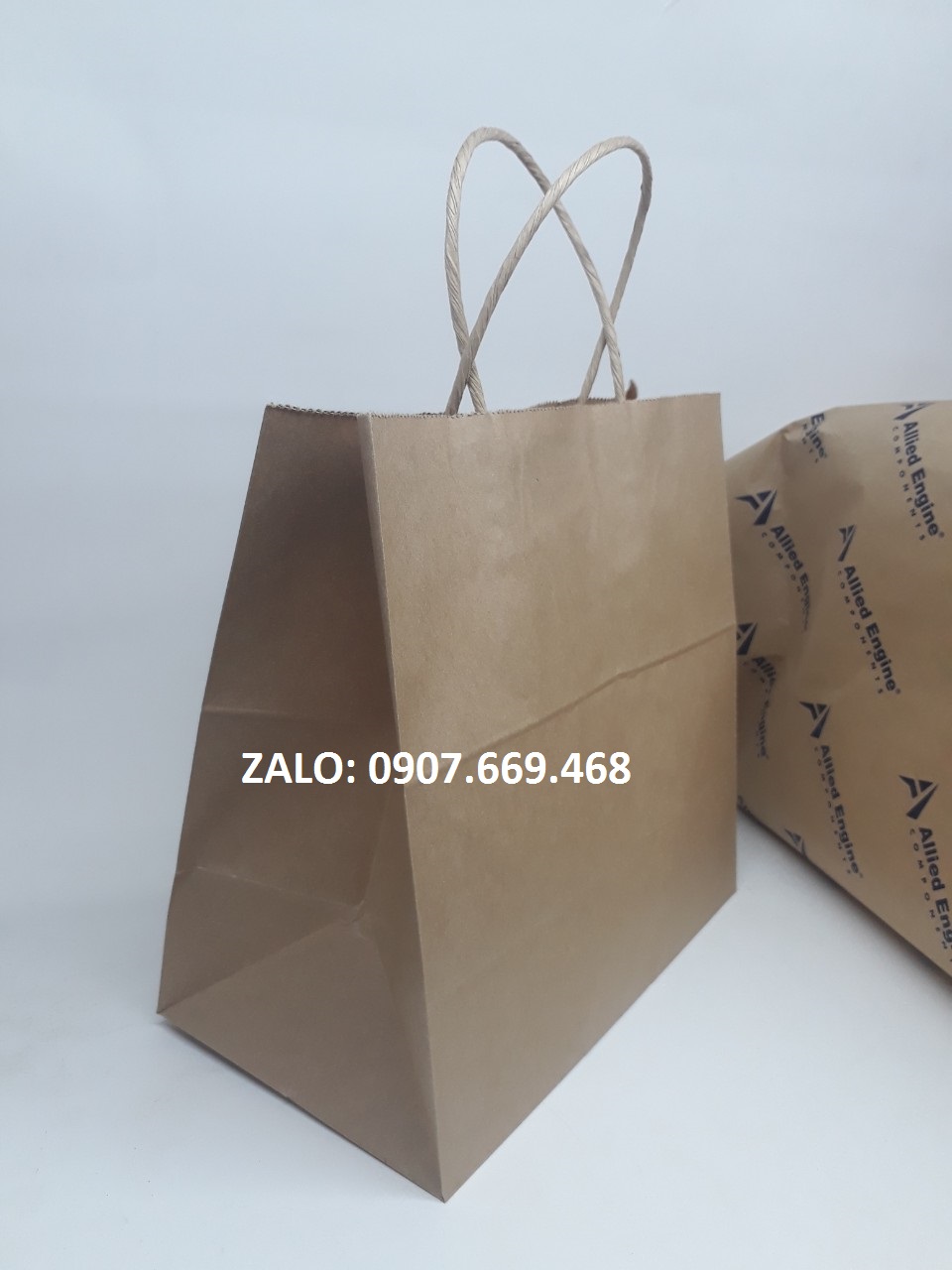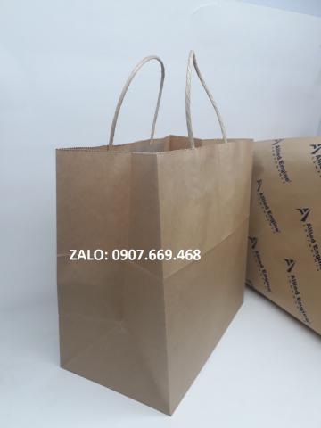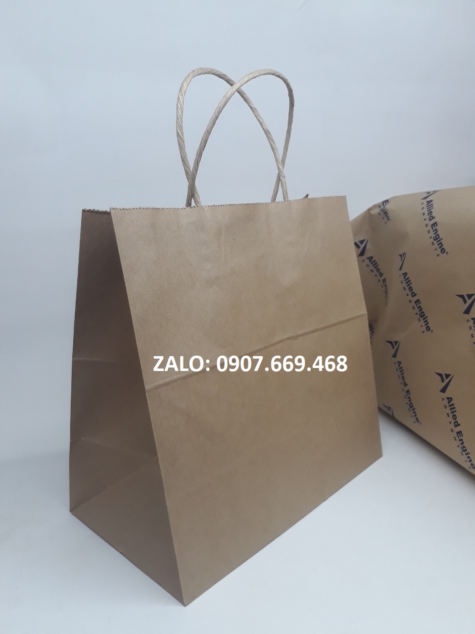 3. Chất liệu, màu sắc: giấy kraft nâu, định lượng giấy 70gsm, quai giấy xoắn chắc chắn, ko bị rơi tuột khi xách, sản phẩm thân thiện môi trường,